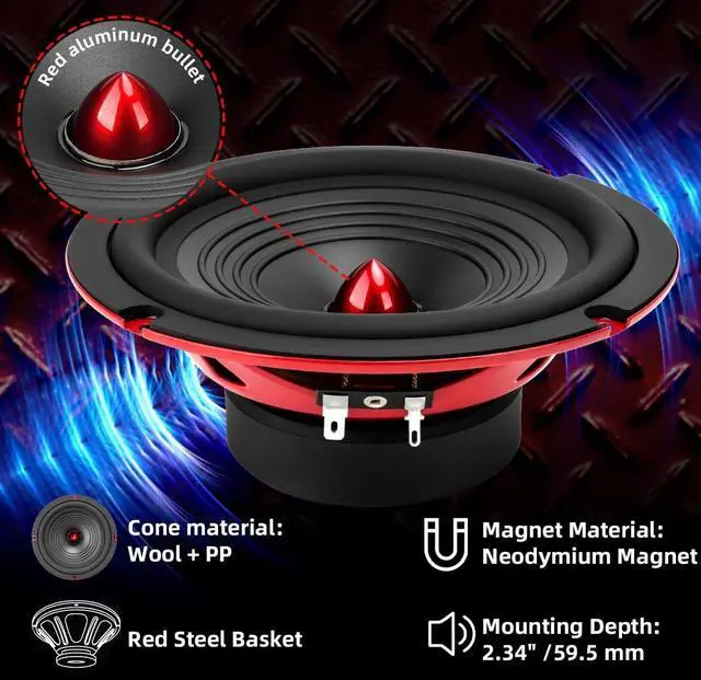 High-Performance Audio - Featuring innovative bullet resonator technology, experience crystal-clear sound. This 6.5 -inch speaker delivers a maximum output power of 800W, offering deep, powerful bass and crisp, detailed highsperfectly suited for all music genres. ^^ Premium Build & Durability - Built to last with wool+pp cones, aluminum alloy baskets, and high-temperature voice coils. Designed to perform reliably in all weather conditions and handle intense use without compromising sound quality. ^^ Easy Installation & Versatile Fit - Direct replacement for most factory 6.5" speakers. Ideal for cars, trucks, SUVs, motorcycles, boats, home audio projects, and moreunleash your creativity with ease.