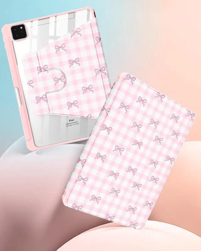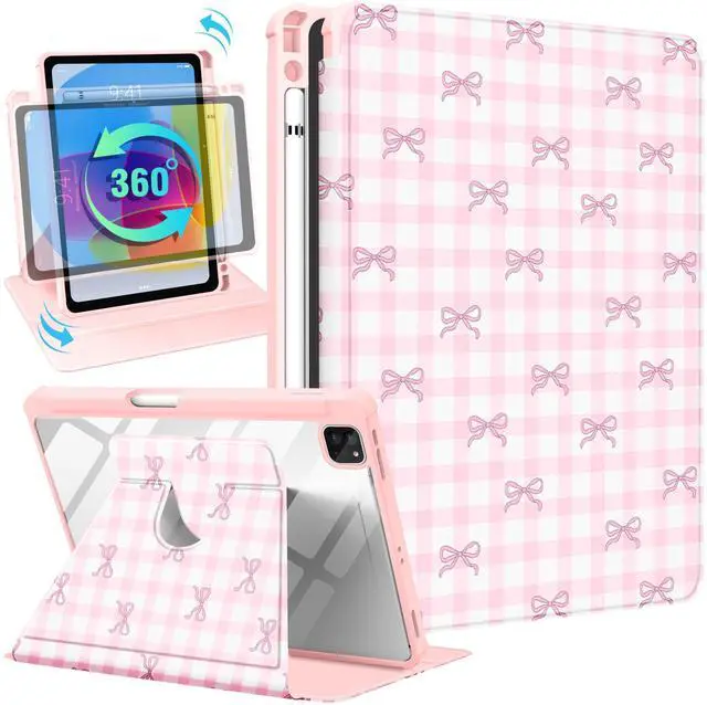 Uppuppy for iPad Air 13 inch Case(Air M4 2026/M3 2025/M2 2024), for iPad Pro 12.9 Case(6th/5th/4th/3rd/2nd/1st Gen) - 360 Rotating Smart Folio Cover with Pencil Holder for Women Girls, Pink Bow Plaid