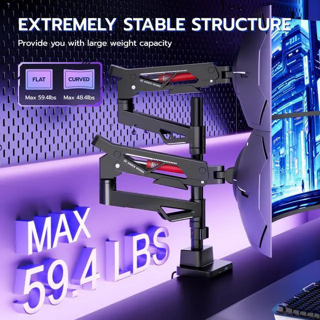 Updated Design and Wide CompatibilityThis ARES WING dual monitor arm is suitable for the largest 57-inch ultra-wide monitor and is backward compatible with 49-inch to 24-inch flat and curved monitors. This premium monitor mount boasts excellent load-bearing performance and can support monitors weighing up to 66 pounds. It also supports ultra-wide monitors like Samsung Odyssey G9 and LG that are compatible with VESA installation dimensions (7575 mm, 100100 mm, 100200 mm, 200200 mm). If your monitor does not have VESA mounting holes, you will need to prepare a VESA installation adapter. ^^ Full Ergonomic AdjustmentThe ARES WING stand allows for smooth and precise adjustment.