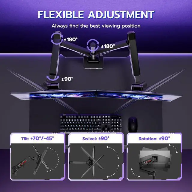 It is equipped with an extended arm that can be easily raised up to 22.5 inches, providing users with a variety of more comfortable viewing experiences. Additionally, the monitor stand for desk can extend to 23 inches to accommodate deeper and larger desktops. This dual-monitor stand allows you to swivel the screen -90to +90, tilt -45 to +70, and rotate -90to +90. Easily adjust the monitor to the optimal angle for maximum comfort. Whether for immersive gaming or comfortable long-term use, this wide range of movement allows you to find the ideal posture, thereby improving posture and performance.