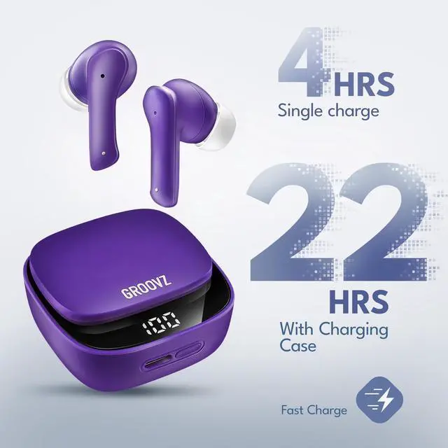 ^^ Crystal Clear Conversations: Communicate seamlessly with dual microphones featuring advanced noise reduction, ensuring every word is heard even in busy environments. With Groovz wireless earbuds, experience clear sound on both ends of the call. ^^ Battery Life at a