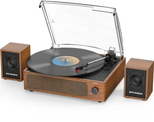 [Upgraded Sound with External Speakers] - Dynamic full-range two external stereo speakers with RCA output provide sound for daily leisure listening; Use the Aux input to connect to your stereo system or the headphone jack for private listening ^^ [Appearance Patent Design] - It adopts an external independent speakers instead of an built-in speakers design, has fully obtained an appearance patent, and the overall design combines a retro appearance with modern technology. It is compact and small, suitable for use in small spaces, and is suitable for record collectors, record enthusiasts, and beginners of turntables ^^ [Three-Speed Belt-Drive Turntable] - Plays 33 1/3, 45, and 78 RPM records; Use the lifting lever to lower the needle and playback; Auto stop after opening, it will automatically stop playing once the playback ends.