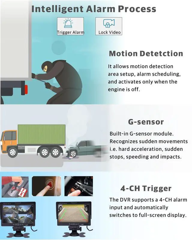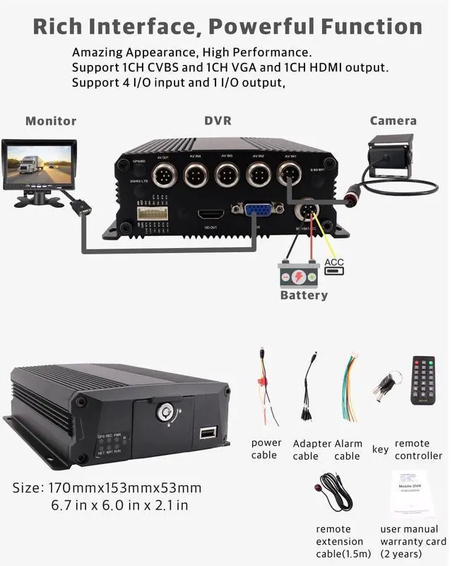 Easy Wiring: Plug-and-play with secure 4-pin connector. USBBackup videos or connect a mouse via USB. G-sensorDetects sudden movements such as hard acceleration, abrupt braking, speeding, and impacts. saves key events. Extended Remote Receiverallowing you to operate the remote without having to reach the DVR ^^