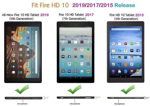 Fire HD 10 tablet 9th CaseThis protective case is designed for Kindle Fire HD 10 tablet 2019/ 2017/ 2015 release (9th Generation/ 7th Generation/ 5th Generation) - 10.1" ^^ Leather Protective caseThe Kindle Fire HD 10 tablet 2019 Case 10.1" is made of high-quality PU leather back cover and durable front synthetic leather cover, providing daily protection for the tablet and preventing dirt, dust, scratches. ^^ Stand FunctionAnti-slip raised stripes allow to set up multiple viewing angles and the stand function can firmly and safely support the Fire HD 10 Tablet Case 8th Generation tablet and keep it stable.