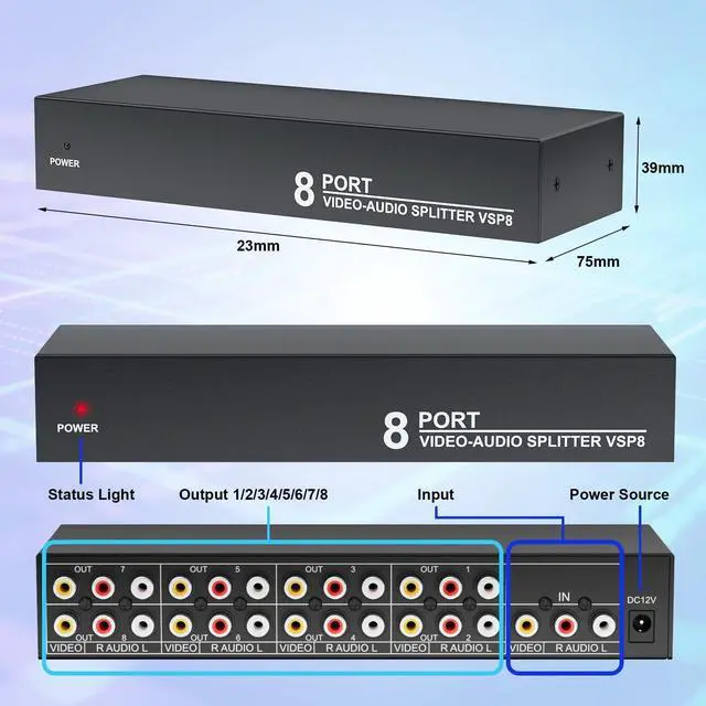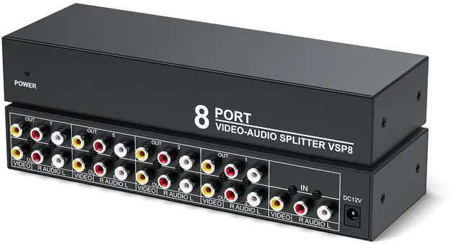 Key Features: 1 Female to 8 Female RCA Ports Split a single RCA source (e. g., DVD player, gaming console) to multiple (1-8) outputs (TVs, monitors) High-quality Ensures superior signal conductivity and corrosion resistance for crisp audio/video transmission Wide Compatibility Works with composite video, stereo audio, subwoofers, and other RCA-based equipment Compact & Durable Lightweight, small size, mental casing Plug-and-Play No drivers or software required; instant setup for hassle-free useIdeal