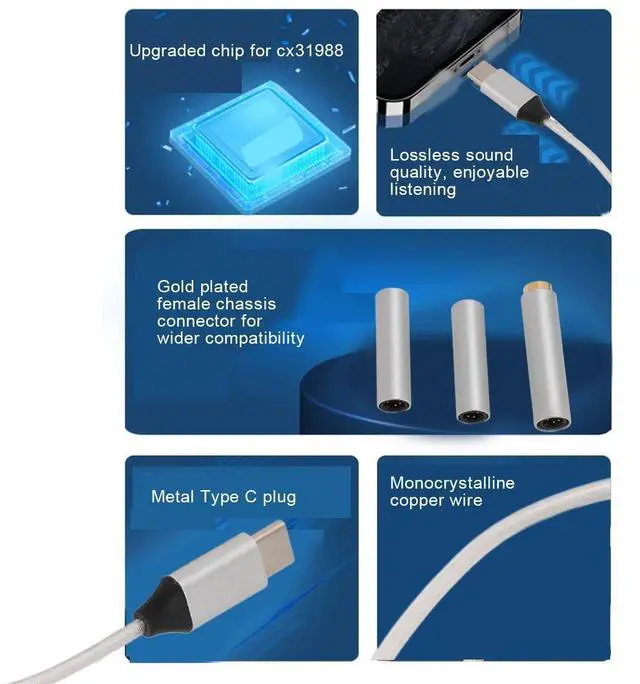 DAC Chip: This USB C to AUX adapter has a built in chip for CX31988, which is an upgraded version of the CX31993 chip on the market. The purpose is to improve the sound quality and resolution, maintain the original sound quality of the headphones, and effectively suppress noise and high interference. 4.