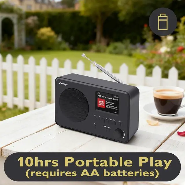 The IR1S also works as a practical alarm clock radio, letting you wake to Internet Radio, FM or a buzzer. Includes snooze and sleep timer functions, making it suitable for bedside use as well as kitchens and workspaces. ^^ Mains or Battery Powered Portability Use the IR1S plugged into the mains at home or power it with AA batteries (not included) for up to 10 hours of portable listening. Easy to move around the house or into the garden, with a clear full-colour display and headphone jack for private listening. A compact, versatile Internet Radio designed for flexible everyday use.