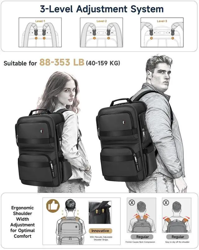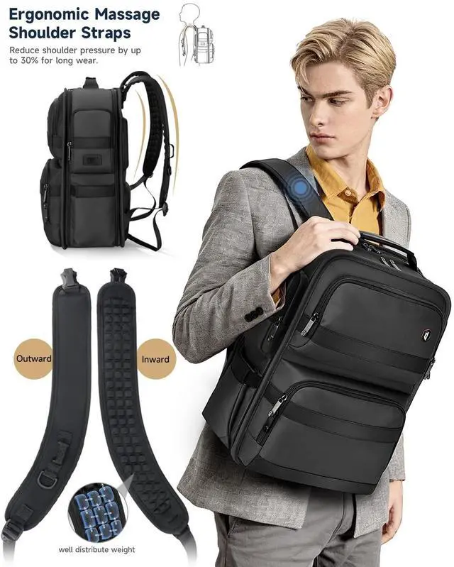 Large Capacity & Dedicated Dual Compartment: This laptop backpack measures 17.7" x 13.8" x 7.8" and weighs only 3lb, offering a spacious 31L capacity. It features a specialized dual-compartment design to securely hold both a 13-16 laptop and an iPad. Perfect as a work or business backpack for men for daily commuting or short business trips. ^^ Patented Massage Straps & Customizable Fit: Featuring an innovative patented design, the shoulder straps offer multi-slot width adjustment at the top. You can easily reposition the straps to fit your body frame, perfectly preventing slipping or pinching. Integrated with 100+ resilient massage particles, it effectively distributes weight and relieves pressure, ensuring a fatigue-free experience even when fully loaded. ^^ Flight Approved & 180
