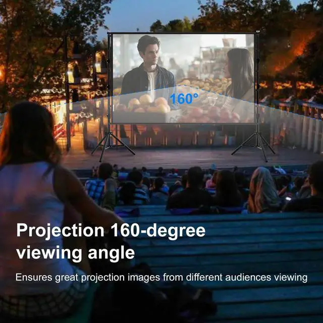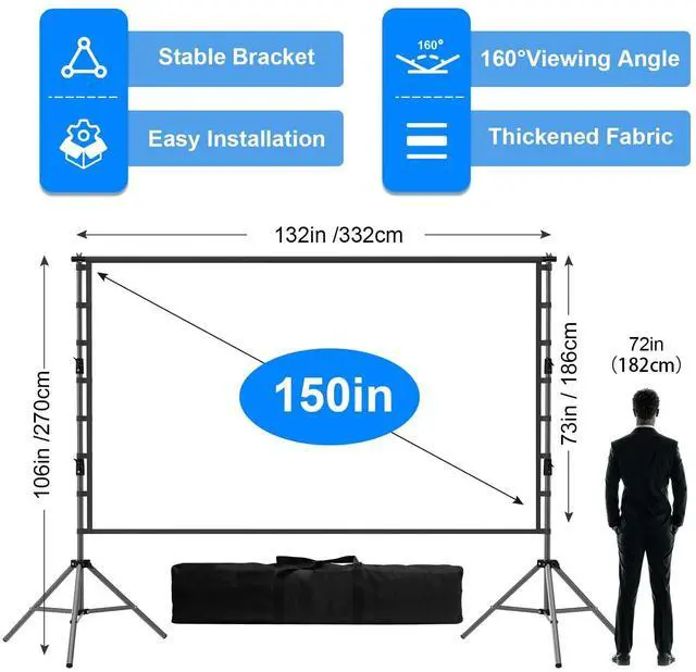 Wrinkle-Free Projection Screen150 inch projector screen with stand, 160 wide viewing angle, 16:9 4K Ultra HD resolution video screen provides a vivid image, provides high-resolution images and even supports front and rear projection screen. The projector screen is made of better quality polyester which is washable and anti crease, Folded and wrinkle-free design brings you more fun and experience a wonderful movie night ^^ Thick and strong Large projector screen standThe outdoor projector screen is very durable and not easy to bend, deform and break, Support Height Adjustable Stand, We are already upgrade the dia of bracket to 1.39 inch.