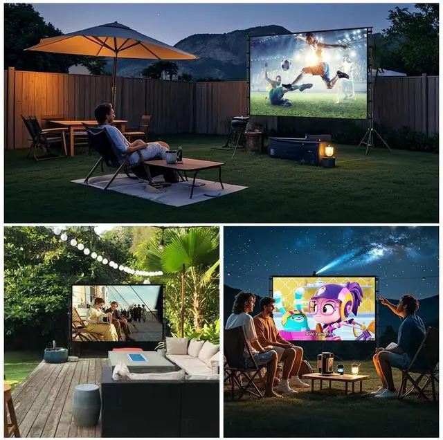 It is a option for birthdaholidays, anniversaries, Thanksgiving and Christmas, Enables usage in outdoors or indoors, home, school, office, camping, conferences, weddings, parties, movies, TV shows, video gamesCreate a home theater outdoor movie screen night, perfect for you to have fun ^^ Easy to Set Up The outdoor movie projector screen comes with 1*150 inch projection screen, 5*Cross Bar, 6*Ground Nail, 6*Rope, 2*Bracket, 1*carrying bag.