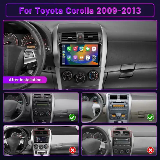 Applicable Models: Double din stereo is designed specifically for the Toyota Corolla 2009 2010 2011 2012 2013, perfectly fitting and plug and play. For 2009 Toyota Corolla radio adopts the Android system and has 2G RAM+32G ROM memory (4-core) storage space. (Not suitable for cars with jbl/bose audio syste or factory screen. Please check the model and year of your car, as well as the shape and size of the center console, before purchasing) ^^ Support Wireless Carplay & Android Auto: For 2010 Toyota Corolla radio is compatible with wireless Apple CarPlay and Android Auto. You can connect to this dual channel car audio system via Bluetooth & WIFI and access most of the functions on your phone, such as music, video, GPS navigation, information, etc. For 2011 Toyota Corolla radio has voice control function. When you need it, just say "Hi, Siri/Google. " It is very easy to use and greatly improves the user experience. ^^ Mirror Link & HD Touchscreen & Split Screen: For 2012 Toyota Corolla radio is equipped with a 2.5D 9'' IPS touch screen that supports mirroring of iOS and Android phones. It allows you to access various functions directly. The split screen function supports same screen display, and both left and right screens can be operated independently. For 2012 Toyota Corolla carplay will bring you a visual feast. ( IOS supports wireless connetion; Android supports wireless/wired connection). ^^ GPS