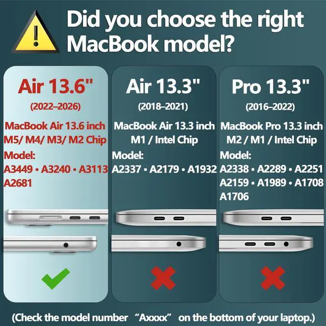COMPATIBILITY -- Only compatible with MacBook Air 13 inch case M5 M4 M3 M2 2026 2025 2024 2023 2022 Release with Liquid Retina Display & Touch ID (models: A3449 & A3240 & A3113 & A2681 - MC6T4LL/A, MW123LL/A, MW0W3LL/A, MW0Y3LL/A, MW103LL/A, MW0X3LL/A, MW133LL/A, MC6U4LL/A, MC6V4LL/A, MC6C4LL/A, MC654LL/A, MC6A4LL/A, MRXV3LL/A, MRXQ3LL/A, MRXN3LL/A, MRXT3LL/A, MXCV3LL/A, MXCT3LL/A, MXCR3LL/A, MXCU3LL/A, MLXW3LL/A, MLXX3LL/A, MLXY3LL/A, MLY03LL/A, MLY13LL/A, MLY23LL/A, MLY33LL/A, MLY43LL/A) ^^ ATTENTION -- Please kindly check the model number "Axxxx" on the back of the laptop before your purchase, make sure you choose the exact same model number as the listing title stated "A3449 or A3240 or A3113 or A2681". The case is not compatible with any other models the above unmentioned ^^ Case dimension & weight -- The case included top part and bottom part. Top part is 13.38 x 8.85 x 0.3 inch. Bottom part is 13.38 x 8.85 x 0.48 inch. The whole case only weights 9.87 OZ. You'll feel your laptop more natural in hand ^^ Fully Vented & design -- No cut out design and logo see through the case. Full vented for safe and heat disbursement. Easy access to all ports and features, you can plug your charger, cable, or headset without removing the case ^^ Package -- Includes a protective case, a keyboard cover, two type c adapters and a screen protector