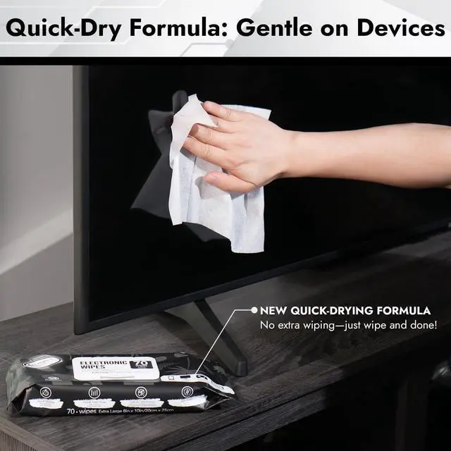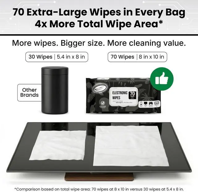 Efficient Cleaning: Each electronic wipe measures 8" x 10", giving you more surface area to clean screens faster and more thoroughlyperfect for TVs, laptops, monitors, and tablets. ^^ Streak Free and