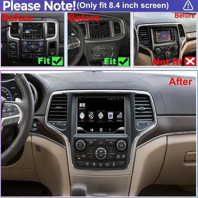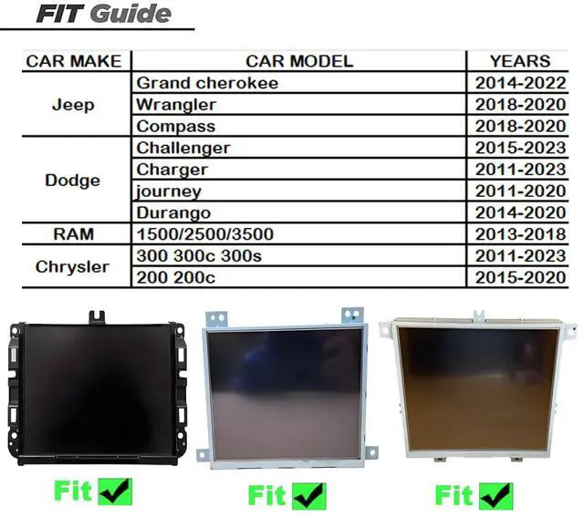 Compatibility: Plug and play Designed for Jeep Grand cherokee 2014-2022, Wrangler Compass 2018-2020, Dodge Challenger 2015-2023, Charger 2011-2023, Journey 2011-2020, Durango 2014-2020, RAM 1500/2500/3500 2013-2018, Chrysler 300 300C 2011-2023, 200 200C 2015-2020. And more selected models, please check the table. package come with everything you need. Include the stereo, wire harness, dash frame and pry tool. Easy to install and integrate with your vehicle's existing systems.