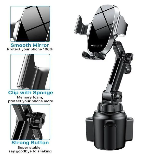 Super Stable & Never Shaking: With the upgraded latest durable and sturdy long neck design, Miracase car cup holder phone mount will provide extreme stability while driving on the bumpiest roads. The deeper clamp arms and soft holding feet provide 360 protection for your phone; Triangle-structure support will hold firmly your phone without concern for your phone moving when you speed up or make a sharp turn. ^^ Big Phones & Thick