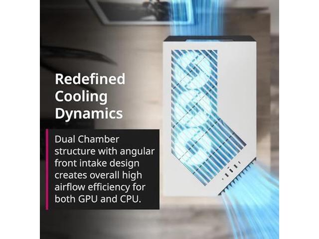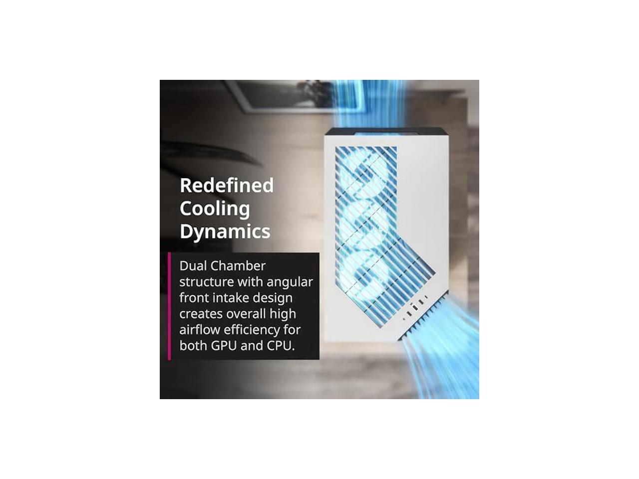 - Dual Chamber Panoramic View Structure With 45deg Angular Front Intake Design - Enhances overall airflow efficiency for both GPU and CPU, while providing a sleek and organized appearance. Angular front intake panel accommodates up to 3 x 12cm, 2 x 14cm, or 2 x 16cm fans, offering flexibility for optimal cooling configurations.