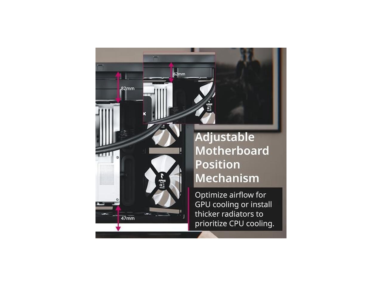 - Adjustable Motherboard Mechanism - Grants you the freedom to optimize airflow for GPU or install thicker liquid coolers at the top, ensuring your thermal management is always on point.