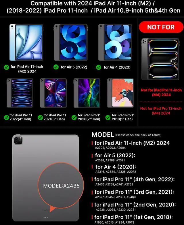 Compatibility:Only fit for 2024 iPad Air 11-inch (M2) , iPad Pro 11-inch (4th,3rd,2nd,1st gen),iPad Air 5th and 4th gen.models include 2024 Air 11 inch (A2902, A2903, A2904),2022 Pro 11 4th Generation (A2759,A2435,A2761,A2762), 2021 Pro 11 3rd Generation (A2377,A2301,A2459,A2460), 2020 Pro 11 2nd Generation (A2228, A2068, A2230, A2231), 2018 Pro 11 1st Generation (A1980,A2013,A1934,A1979), 2022 10.9-inch Air 5th Generation(A2588,A2589,A2591) 2020 10.9-inch Air 4th Gen (A2072,A2316,A2324,A2325).NOTE:NOT FIT FOR IPAD PRO 11(M4) 2024,We're happy to help! Reach out to us if you need to check compatibility.