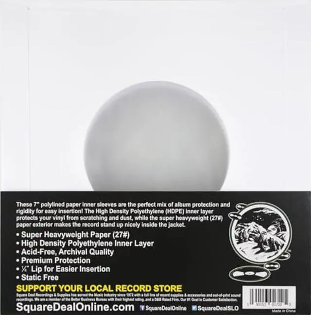 These 7" polylined paper inner sleeves are the perfect mix of album protection and rigidity for easy insertion! The High Density Polyethylene (HDPE) inner layer protects your vinyl from scratching and dust, while the super heavyweight (27#) paper exterior makes the record stand up nicely inside the jacket. Super Heavyweight Paper (27#) High Density Polyethylene Inner Layer Acid-Free, Archival Quality Premium Protection Exterior Glued Flaps for Easier Insertion 1/4" Lip for Easier Insertion Static Free Each sleeve measures 7-1/8" x 7" (181mm x 178mm)