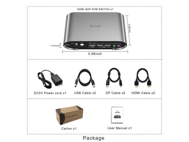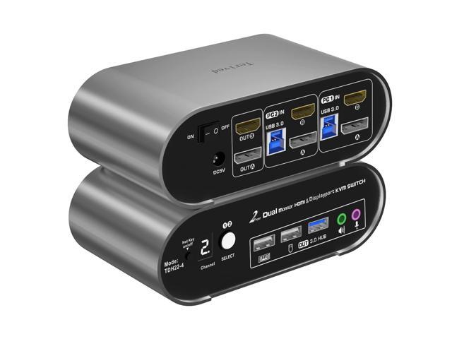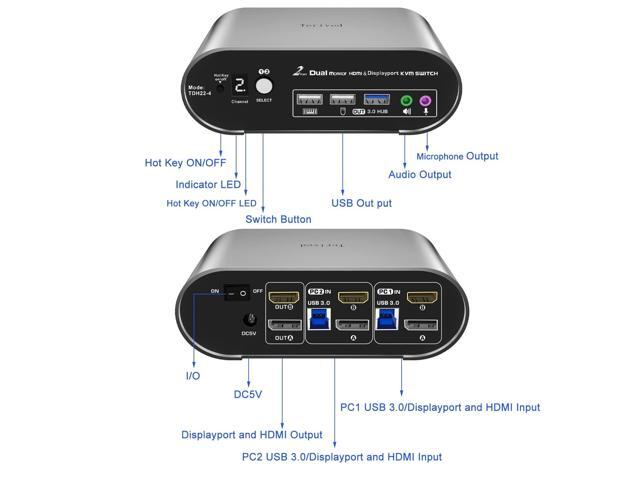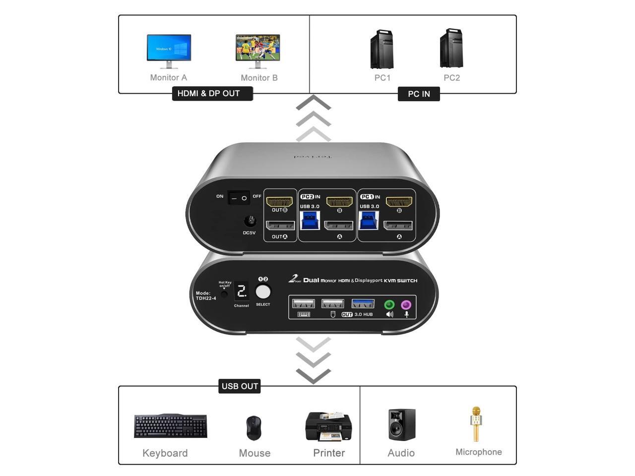 Two computers two monitors KVM Switch - Control two computers with HDMI and DP interfaces, along with other compatible devices, using a single keyboard and mouse. Connect one HDMI monitor and one DP monitor. Enjoy separate audio and microphone output, as well as a USB 3.0 HUB. If you need more USB port we suggest a self-power 5V 3A USB spliter.