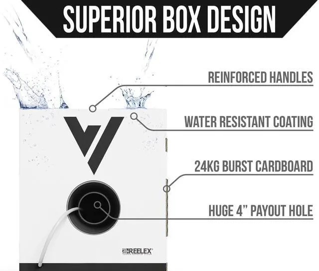 TIME SAVING FEATURES. Patented winding technology & massive payout hole eliminate kinks and tangles. Reinforced handles, super-durable cardboard, & water resistant coating keep the box intact. Jacket fe