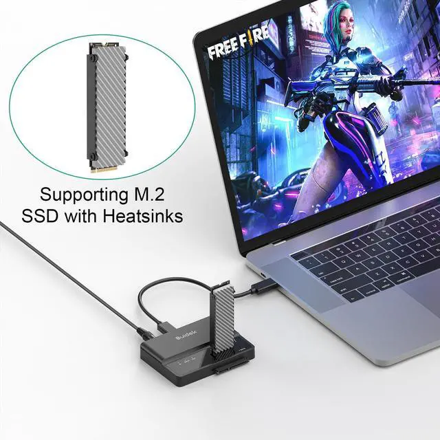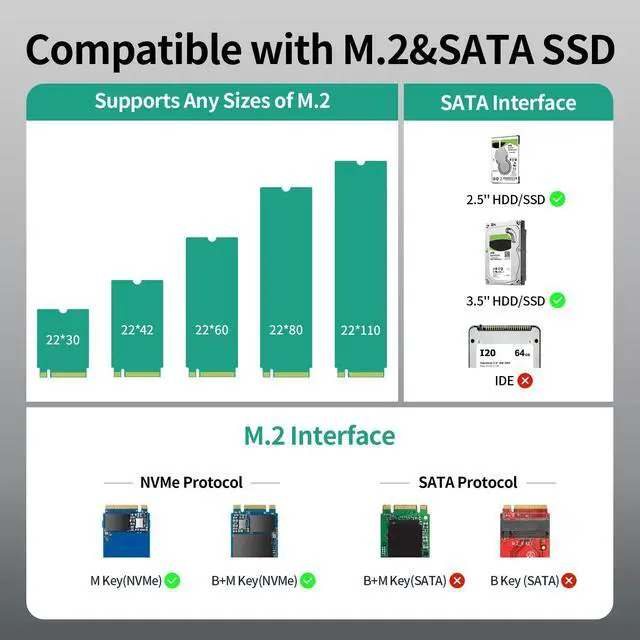 [(Support M.2 NVMe and SATA SSDs to USB)] This M.2 hard disk enclosure will meet your needs whether you are using NVMe M.2 or 2.5"/3.5" SATA hard drives. NVMe M.2 to SATA adapter's open design accommodates M.2 drives of any size (M Key, B&M Key) and with built-in shield/heatsink, ideal for users managing multiple hard drives that need frequent swapping