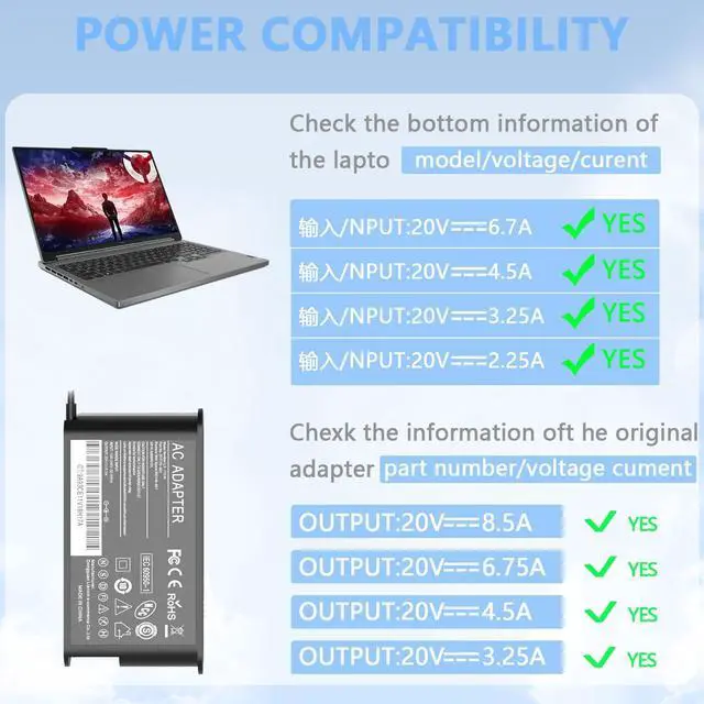 Power Specs: Input : 100-240V 50-60Hz, Output: 20V-85A, Watt:170W wattage,Not Compatible with 300W And 330W