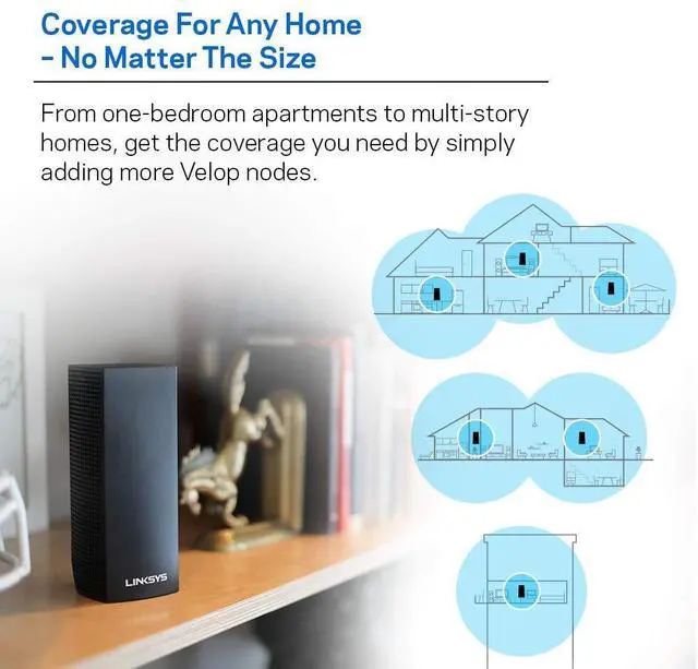 Linksys Velop is the is the Tri Band Wi Fi system that works in perfect harmony to create a high range mesh network. Now in black, Velop blends in perfectly with your home's style or accessories. Unlike traditional routers with range extenders, Velop's Tri Band Wi Fi system offers connection points that provide 100 percent Internet speed throughout your home. By utilizing wireless mesh networking for whole home Wi Fi, Velop delivers the freedom of reliable, secure, seamless connectivity throughout your home and even outside. Each Node increases Wi Fi range 2, 000 sq.