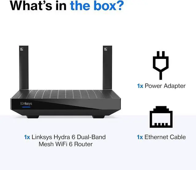 Introducing the Linksys Hydra 6 Mesh WiFi Router - Using the power of WiFi 6 to deliver lightning-fast internet speeds, seamless connectivity, and unmatched reliability, all in a sleek and stylish package. Linksys Hydra 6 is powered by WiFi 6 technology, so you'll experience fast internet speeds of up to 2.2 Gbps, making it perfect for streaming 4K videos, playing online games, and working from home without lag or buffering. Mesh WiFi 6 technology ensures you'll have a strong and stable signal throughout your home. With the Hydra 6, you can say goodbye to dead zones and weak connections.