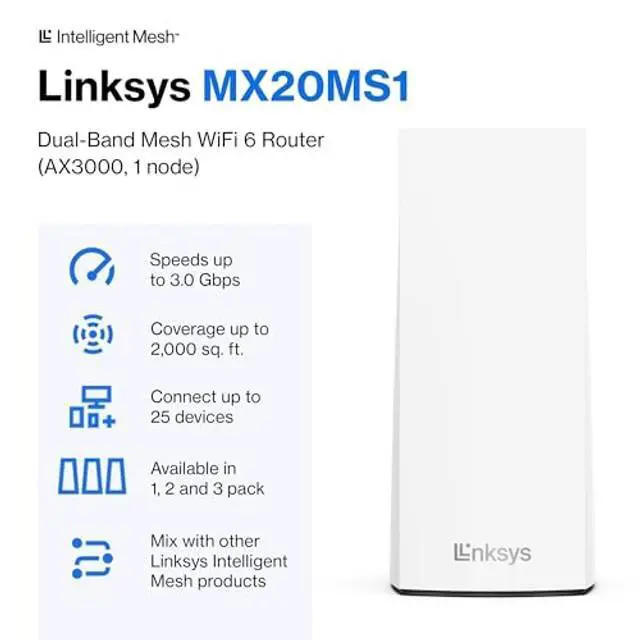 Linksys Atlas 6 mesh WiFi router brings the reliability and speed of WiFi 6, at an incredibly affordable price. This dual-band AX3000 mesh wireless router accesses 160 MHz channels for more powerful and stable connections, supporting speeds up to 3.0 Gbps. Linksyss Intelligent Mesh Technology means this WiFi 6 router can grow with you, simply add more routers to expand coverage for stronger connections to more devices. Covering up to 2, 000 sq ft, and supporting 25+ devices, your entire family can stream, game, and video chat without interruption all from the same WiFi mesh network.