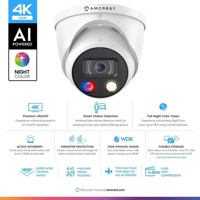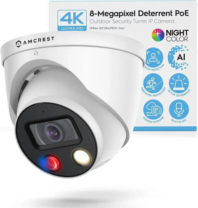Amcrest UltraHD 4K (8MP) IP POE AI Camera, 4K @30fps, 98ft Night Color Vision F1.0, Security Outdoor Turret Camera, Vehicle & Human Detection, Active Deterrents, Built in Microphone, IP8M-DT3949EW-3AI