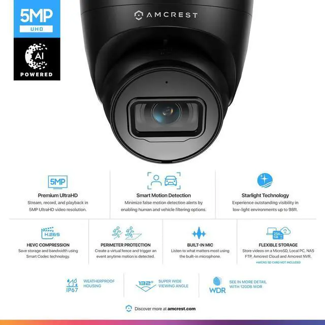 DAY OR NIGHT, RAIN OR SHINE Built to weather any storm and the darkest of nights, this 5-Megapixel Turret PoE IP Camera features a heavy-duty weatherproof IP67 housing as well as a CMOS technology image sensor to achieve night-vision up to 98 feet. AI Features include IVS: Tripwire & Intrusion. Smart Motion Detection includes Human & Vehicle Detection. Dual H.265/H.264 compression allows for maximum encryption with the latest technology.
