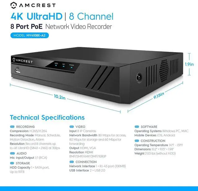Quality: Supports 8-Channel 1080p/3MP/4MP/5MP/8MP/4K Resolution Records 8-Channels @ 1080p/3MP/4MP/5MP/8MP/4K & Playback 8-Channel @1080p (30fps) /4-Channel @4MP (30fps) /2-Channel @4K (30fps) Record in Widescreen, Quick Access QR Code Remote Viewing on iOS and Android Smartphone/Tablet Devices (w/ included Amcrest View app) The A2 Series Support camera's AI features, All AI features are controlled on the camera side so the AI features available on the NVR may depend on the model camera being used. There are No Built-In AI features associated with this NVR. Advanced H. 265 compression technology lets you save on storage space which allows for longer recording times. H. 265 technology compresses your video without sacrificing any of the UltraHD video quality Max 80Mbps Incoming Bandwidth, records 7 cameras @ 4K using H. 264. Records 8 cameras @ 4K by changing default settings from H. 264 to H. 265 and adjusting bit rate to 1792 on each camera for maximum optimization