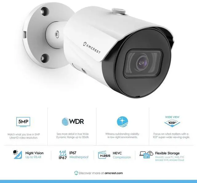 FEATURES: 5MP @20fps High Resolution, 2560 x 1440P Remarkable FOV 103, 1 IR LED Night Vision Up to 98 feet IP67 rated Indoor/Outdoor Weatherproof; Metal Housing Wide Dynamic Range up to 120dB. Dual H. 265 / H. 264 Compression Technology. One way Audio with Built-in Microphone. MicroSD Storage up to 256GB.