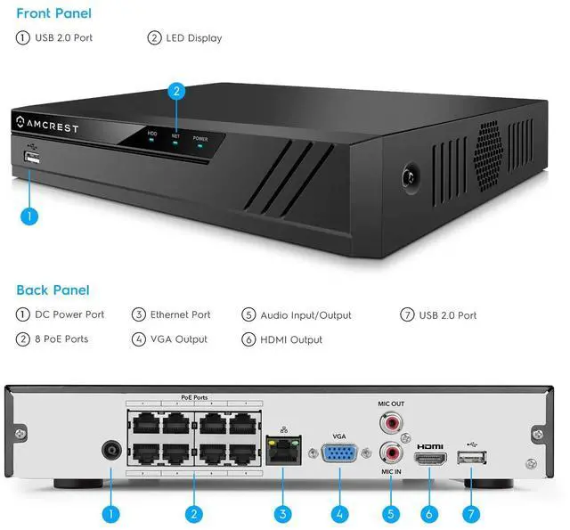 SKU: NV4108E-IP5M-B1186EB4-2TB The Amcrest 8-Channel NVR This Amcrest 8-Channel NVR comes with a Pre-Installed 2TB Hard Drive (Supports hard drives up to 10 Terabytes), simultaneously managing and recording up to eight 4K (8MP) cameras to deliver video quality and performance that is unsurpassed in the consumer security technologies market. Superior HD 5MP at 20 FPS Featuring the latest progressive scanning image sensor and chipset, the Amcrest UltraHD camera soaks in the entire scene, dynamically painting all the vivid colors and rich imagery, pixel by pixel, onto your computer screen or smartphone in full 2592x1944 resolution at 20 frames per second (FPS). No need to strain your eyes, lean in close, or play the guessing game when you have this level of detail. Plug and Play Setup Easy to configure, access, and control. Scan QR Code on the NVR from the "Amcrest View" app (available on iOS and Android) to instantly access live viewing and playback. Connects to and manages all the cameras on your network for ultimate ease and convenience in a home security system. Fast and Reliable Watch things happen as they happen: real-time, highly reliable HD video without loss or delay. Conveniently packaged with all needed components such as network cables and quick start guide with user manual. Guaranteed Peace of Mind Includes USB backup feature for peace of mind. All systems CE & FCC certified with UL compliant power supplies. Guaranteed for a Full Year from purchase with US Warranty and Lifetime Support offered exclusively by Amcrest. Color Black Camera Style Bullet Number of Channels 8 Camera Resolution 5-Megapixel Number Of Cameras 4 Night Vision 98 FT / 30 Meters Pan/Tilt No Technology Standard HD IP PoE Resolution 5-Megapixel Model NV4108E-IP5M-B1186EB4-2TB Text Above Add to cart Button 0 Try Amcrest Cloud 1 Request Info Button 0 Hide Price 0