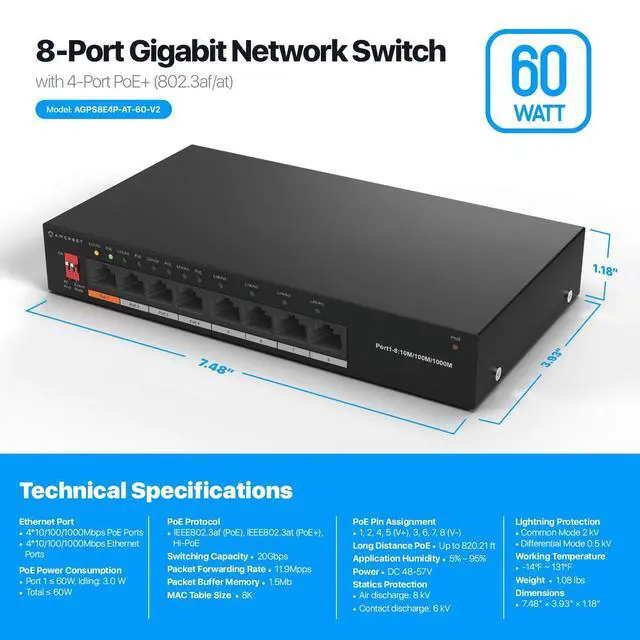 PACKAGE INCLUDES: 1 x 8-Port Gigabit Switch with 4-Port PoE (AGPS8E4P-AT-60-V2)