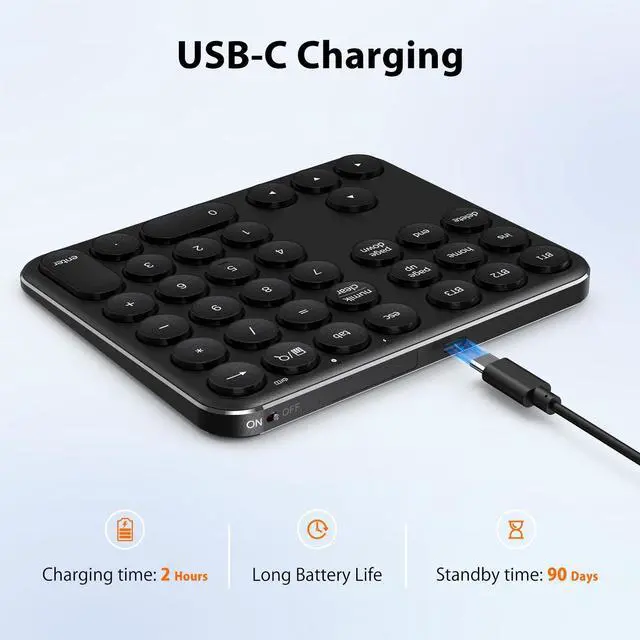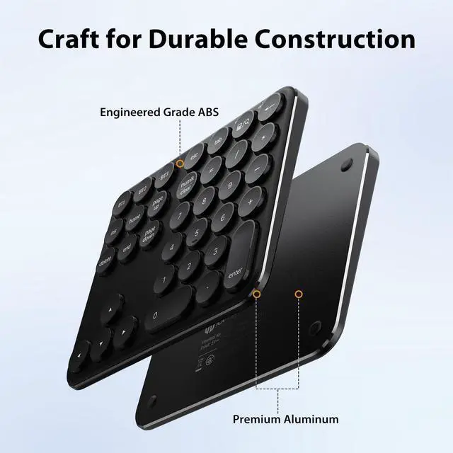 USB-C Rechargeable & Long-Lasting Battery: Equipped with a built-in high-capacity lithium battery, this Bluetooth number pad supports fast and convenient USB-C charging. Enjoy up to 90 days of continuous use on a single chargeideal for travel, remote work, and everyday office use without worrying about frequent recharging. ^^ Slim, Sturdy & Built to