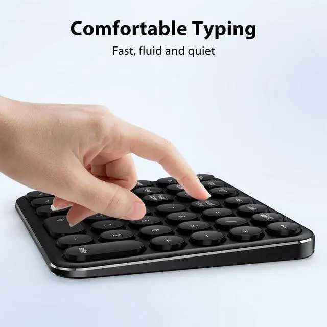 Last: Crafted with a sleek stainless steel frame and premium ABS cover, this slim Bluetooth number pad combines durability with style. The scissor-switch keys offer a quiet, laptop-like typing feelperfect for long hours of use at home, in the office, or on the go.