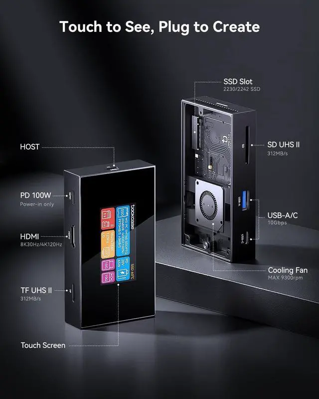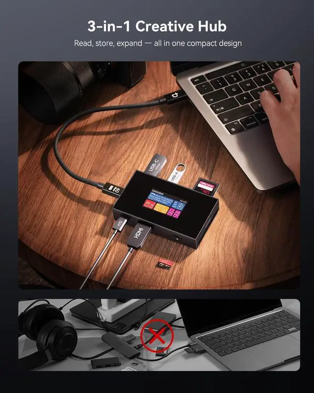 Real-Time Control: Stay informed and in control with a responsive touchscreen that displays real-time data at a glance. The intuitive smart interface makes device monitoring and adjustments effortlessdelivering a smooth, efficient, and user-friendly experience that goes beyond traditional hubs ^^ 4K Display, Fast Charging & Pro