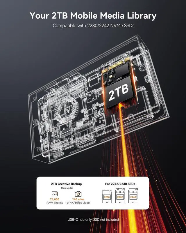 USB-C Hub: Maximize efficiency with this multifunctional device, combining a high-speed M. 2 NVMe SSD enclosure (10Gbps, 2230/2242 support) and a 7-in-1 USB-C hub. Enjoy PD 100W fast charging, 4K@120Hz HDMI, 10Gbps USB-C/USB-A ports, and a UHS-II SD/TF card reader for seamless expansion and quick data access across all your devices ^^ Cooler Than Ever with