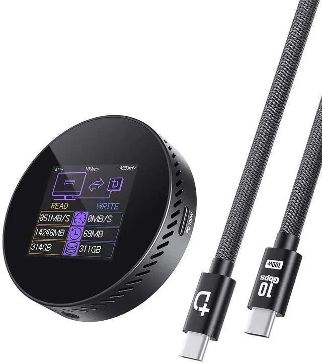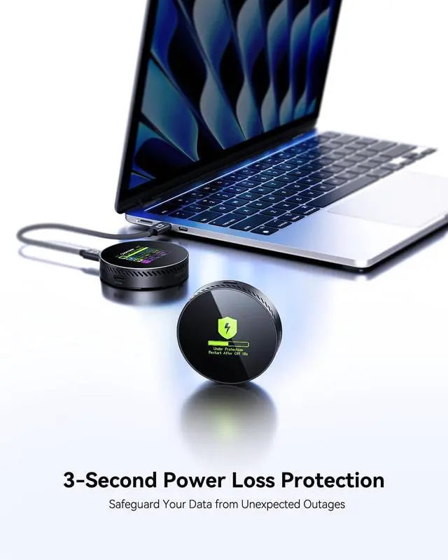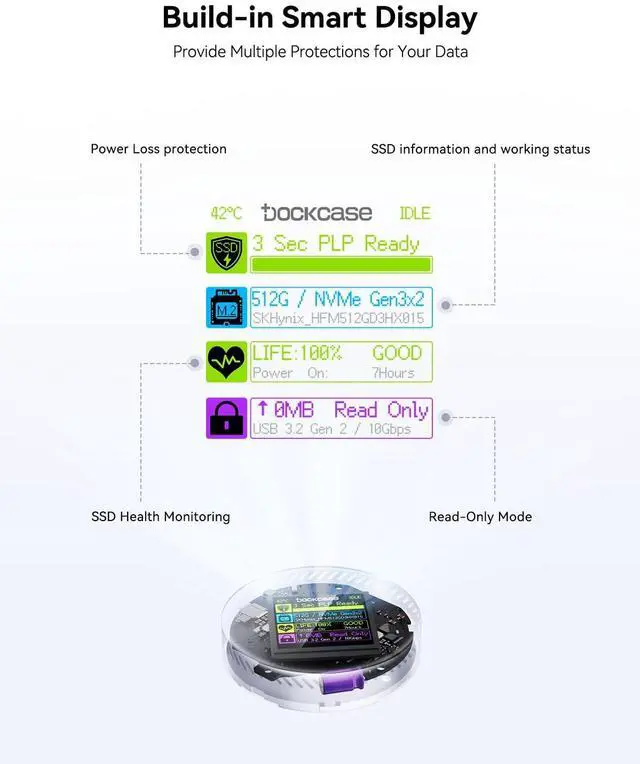 This feature provides an additional 3 seconds of power after an unexpected shutdown, ensuring critical data is safely written and preventing corruption, offering peace of mind for important work ^^ Blazing-fast 10Gbps transfer speeds with up to 2TB storage expansion, leveraging USB 3.2 Gen2 technology for rapid data transfers of up to 1000MB/s. It supports M. 2 NVMe 2230 SSDs, providing ample storage space for large files, making it the ideal solution for professionals handling high-volume data backups and transfers ^^ Smart screen monitoring for real-time SSD health tracking, featuring an integrated HD display that provides instant insights into SSD lifespan, usage cycles, remaining capacity, and overall health status.