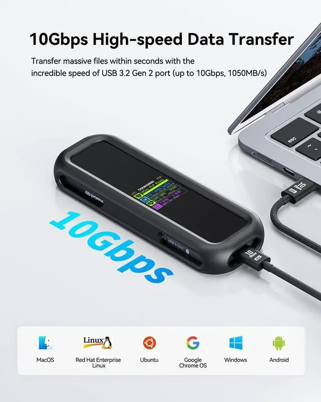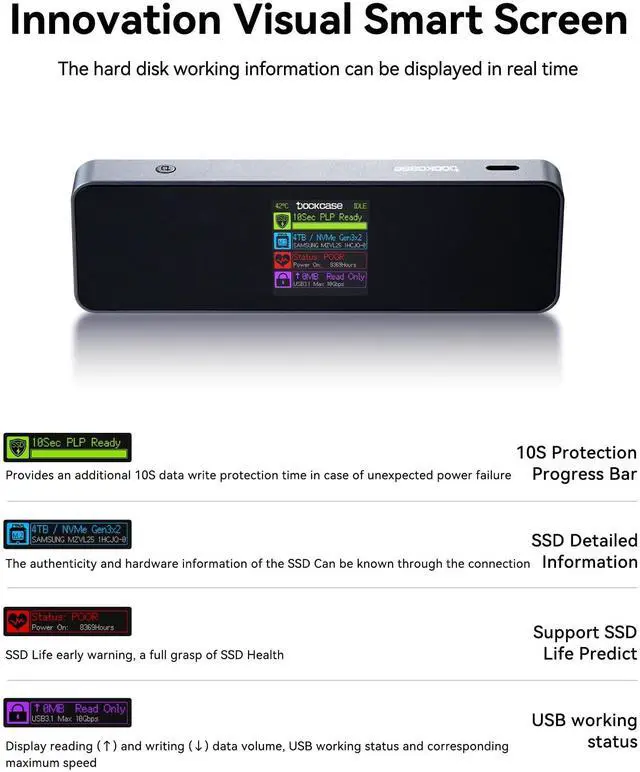 Support SSD Life Prediction and Identify the Authenticity of Information to Avoid Buying Inferior Disks:Support SSD Life Prediction & Verify Disk Authenticity to Avoid Inferior Purchases: The first smart SSD enclosure with an HD display, enabling intelligent SSD detection at power-on. The enclosure instantly analyzes and displays SSD health, lifespan, power-on count, and remaining capacityensuring safer data and more reliable performance