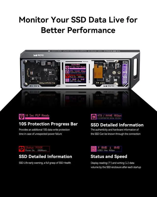 Real-Time Health Monitoring: Built-in HD display shows your SSDs health, lifespan, power-on times, and remaining capacity at a glance. Keep your data safe and avoid unreliable drives with instant insights ^^ Protect Your Data from