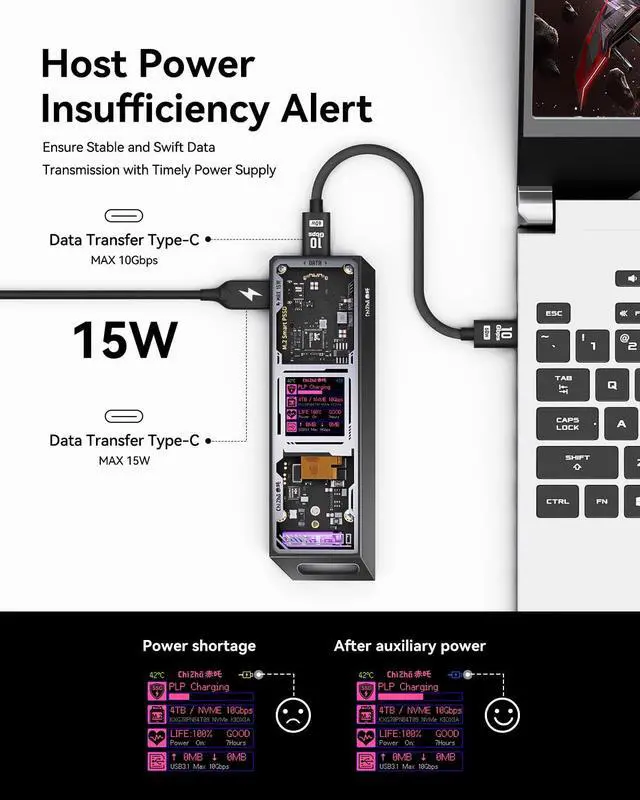 SSD Use: If your computers USB port cant provide enough powerlike front panel USB or USB-A ports that usually supply only ~ 4.5W your high-capacity SSD may not run smoothly. A yellow alert on the enclosure lets you know when to connect auxiliary Type-C power, ensuring stable performance and safe data transfer ^^