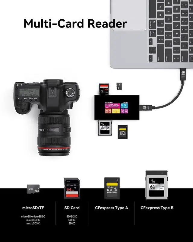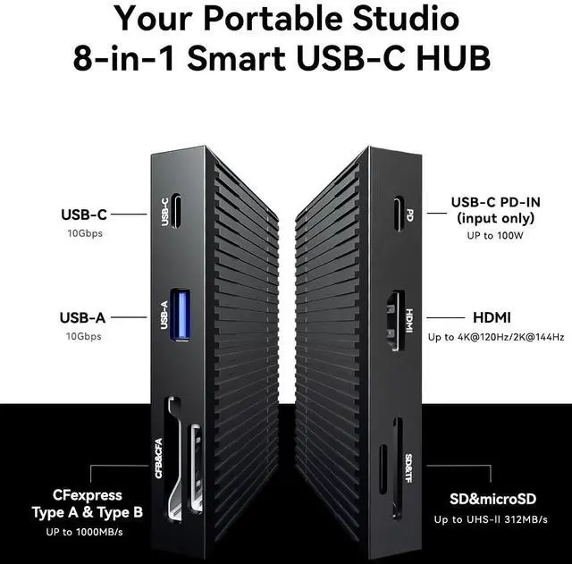 Professional Card Reader: Designed for use with CFexpress Type A/ Type B and SD UHS-II memory cards. High-speed USB 10Gbps (USB 3.2 Gen 2) transfer rates with USB Type-C, CFexpress Type A memory card transfer speed up to 800MB/s, Type B memory card transfer speed up to 1000MB/s, UHS-II SD memory card transfer speed up to 312MB/s. Compact and portable design for photographers and videographers on the go. (Support 3 cards used simultaneously, CFexpress Type A and Type B cannot be used at the same time) ^^ High-Speed, High-Def: Supports up to 100W (minus 20W for operation), USB-C and USB-A data ports provide file transfer at speeds up to 10 Gbps, while an HDMI port supports media display at resolutions up to 4K@60Hz/4K@120Hz ^^