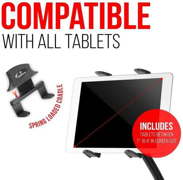 22" Rigid Aluminum Neck Seat Rail Tablet Mount Looking for an iPad or Tablet holder for you vehicle? Look no further. Our 22 gooseneck tablet holder installs directly to the passenger side seat rail. All hardware is included. This allows for quick and easy installation. The adjustable arm allows for fine tuning the perfect position. Optional floor brackets are included for screwing the mount directly into the floor of the vehicle. Great solution for becoming ELD Compliant, Fleet vehicles, and taxi services. DEVICE COMPATIBILITY - Be ELD Compliant. The tablet cradle will accommodate any tablet with a screen size between 7" and 18.4", or a tablet with a width between 6.25" and 10.5".