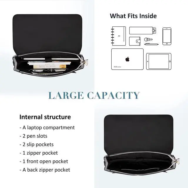 Large Capacity Laptop Bag - Interior, a padded compartment fits up to 15.6 inch laptop, a main compartment for books, A4 binder, 2 pen slots and 4 small pockets for cards. Exterior: Pocket under the flap for easy storage, a zipper pocket on the back.