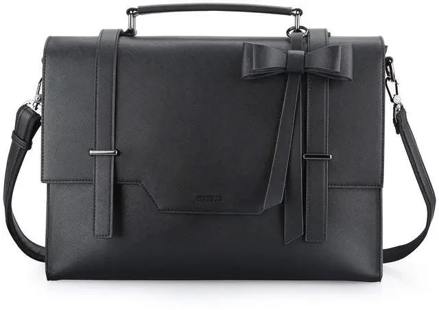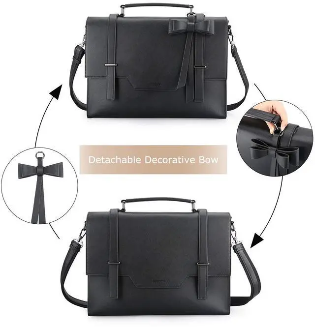 Exterior: back zipper pocket for quick access. ^^ VERSATILE- Designed with top handle and a removable and adjustable shoulder strap(drop: 11-25), this laptop bag can be used as a briefcase, satchel handbag or a shoulder bag to carry your daily stuff. ^^ ORIGINAL DESIGN - A detachable bow adds a more feminine touch to this professional briefcase. Suitable for college, work, business trip, to hold a laptop, wallet, phone, binder, folder, padfolio, etc. ^^ SPECIFICATION- Made of high-quality vegan leather in Saffiano pattern. Equipped with 2 high-quality buckles, avoid suddenly opening.