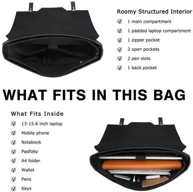 LARGER CAPACITY- Interior: 1 main compartment with 1 padded pocket for a laptop up to 15.6 inches, 2 small slip pockets, 1 small zipper pocket;
