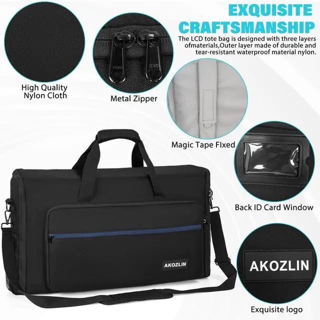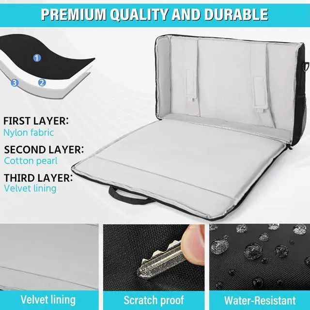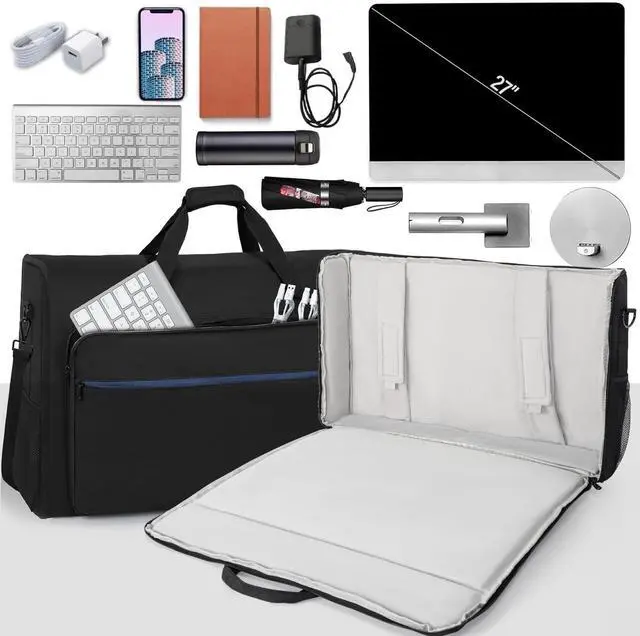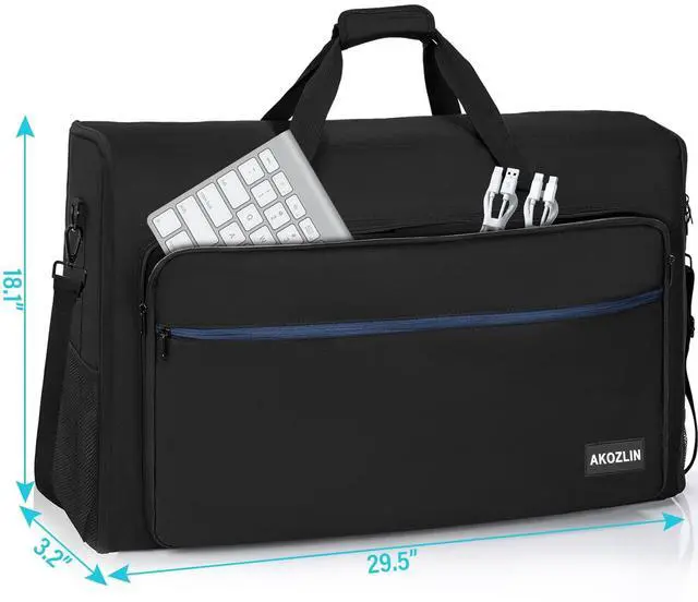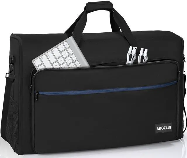Note: please separate the screens and the stands, then put the Screens/TVs into the bag ^^ Professional DesignedCreated by professional designers, the inner is soft velvet lining, interior padding and foam (thick 10mm) block cradle for perfect protect your screens from scratches and bumps all around. A transparent label pocket on the back can help you distinguish bag quickly ^^ Multi CompartmentAdjustable padded belts can stabilize the screen and reduce shaking ^^ Large capacityIt is easy for you to put keyboard, mouse, headphone, remote control, trackpad and other Accessories. Two side mesh pockets for on-the-go items ^^ For TravelSturdy handles and a detachable shoulder strap, luggage strap also attached. Great for the office to keep everything within reach or to make a mobile office to carry what you need on the go. Perfect for tailgates, tradeshows, conventions, live events, DJ/Karaoke, PC gaming etc